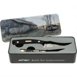 Model – SCH1135986. Old Timer Hunter Combo. 9 inch (22.86cm) overall. 3.75 inch (9.53cm) satin finish 8Cr13MoV stainless guthook blade. Black and gray TPE handle. Full tang. Includes 8.5 inch overall saw with 6 inch serrated blade. Black nylon belt sheath. Boxed with hanging tab. Made in China.