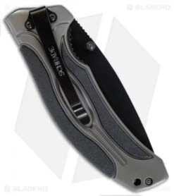 - Black finished stainless steel drop point blade with dual thumb stud opener.