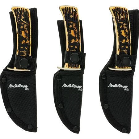 Model – SCHP1157965. Elk Fixed Blade Set. 7.13 inch (18.11cm) overall. 3.25 inch (8.26cm) satin finish stainless blade. Staglon handle. Brass guard. One each: drop point, clip point, and guthook blades. Elk handle artwork. Clam packed. Made in China.